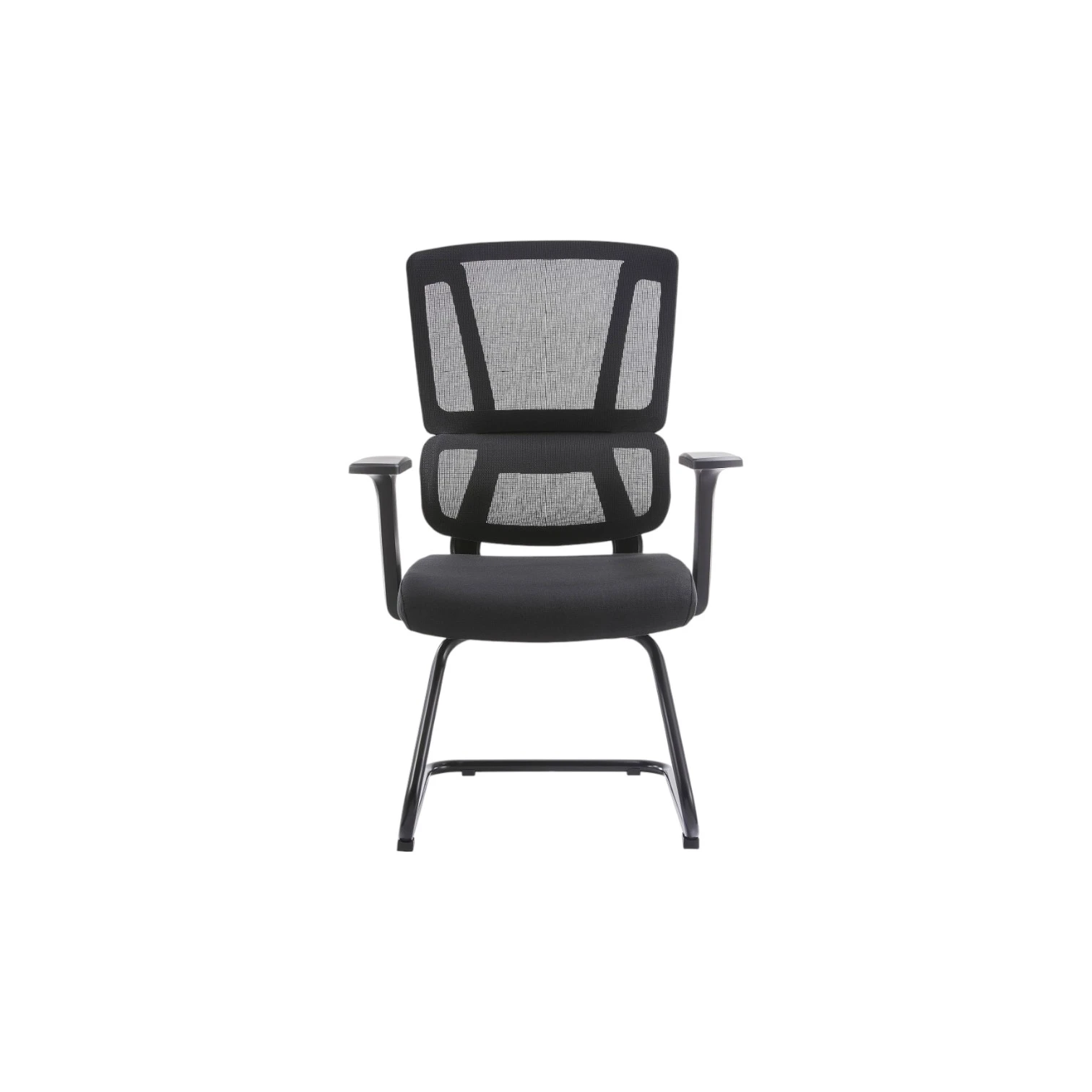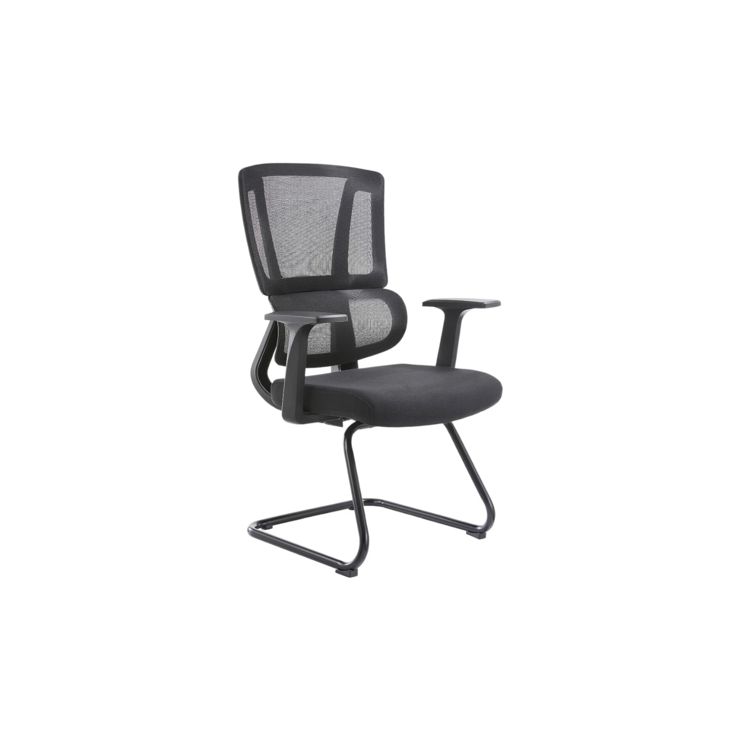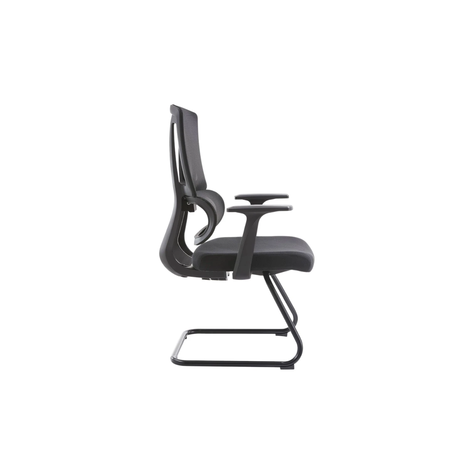 Stol je opremljen z integriranimi naslonjali za roke v obliki črke T in podnožjem v obliki smuči. Prevleka je izdelana iz blaga, stol pa omogoča nagibanje naprej in nazaj. Stol je črne barve.