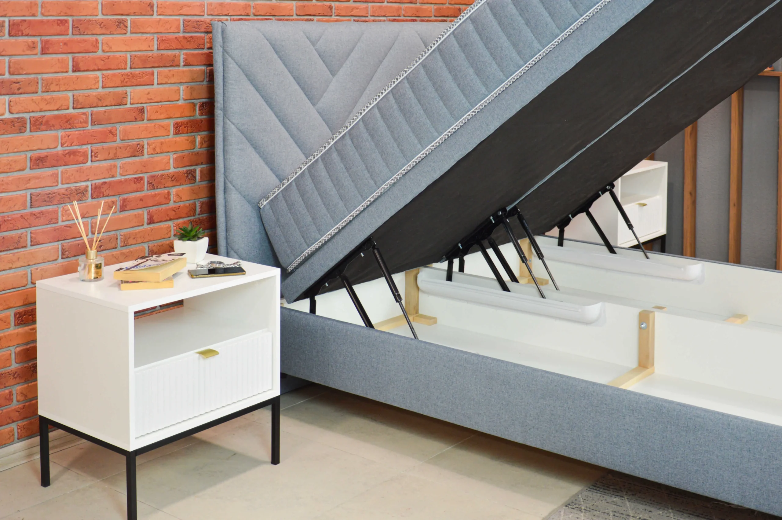 Sodobno oblazinjena postelja, zasnovana za udobje, estetiko in maksimalen izkoristek prostora. Elegantno oblikovano vzglavje z vertikalnim prešitjem nudi odlično oporo pri branju ali počitku, hkrati pa prostoru doda pridih prefinjenosti.  Postelja ima prostoren boks za shranjevanje, ki se odpira z dvižnim mehanizmom. Idealen je za shranjevanje posteljnine, odej, vzglavnikov ali sezonskih oblačil. Na voljo je v različnih barvah in materialih (tkanina, žamet ipd.), zato jo lahko popolnoma prilagodite svojemu prostoru. Možen je nakup vzmetnice kot je na sliki, vendar Vam priporočamo Vzmetnice MojSan.