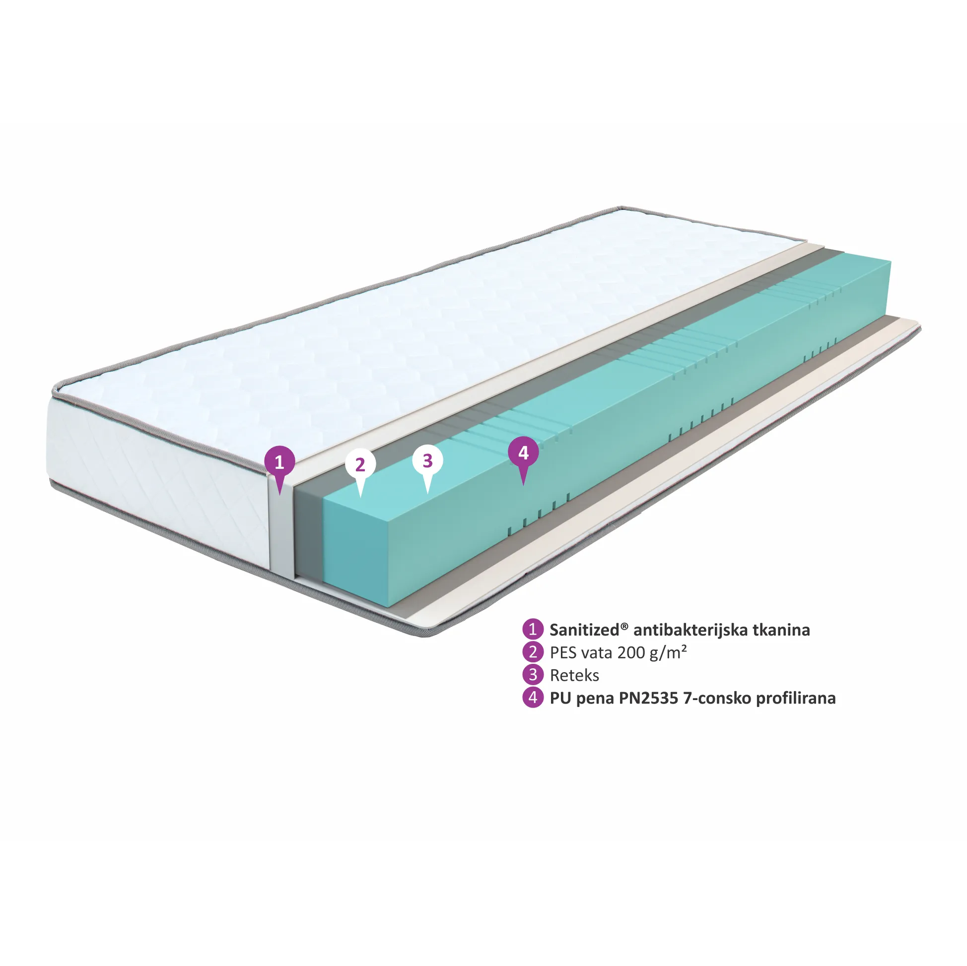 Ležišče Basic iz pene je iz osnovne pondube ležišč MojSan®. Jedro ležišča je sestavljeno iz PU pene, ki telesu zagotavlja dobro oporo in daje občutek normalne trdote, če je ležišče dopolnjeno z latoflex podlago. Anatomsko prilagajanje vašemu telesu smo omogočili s 7-conskim profiliranjem jedra ležišča. Prevleka s Sanitized® higienskim tretmajem je antibakterijska in antialergijska, ki pa ni pralna.