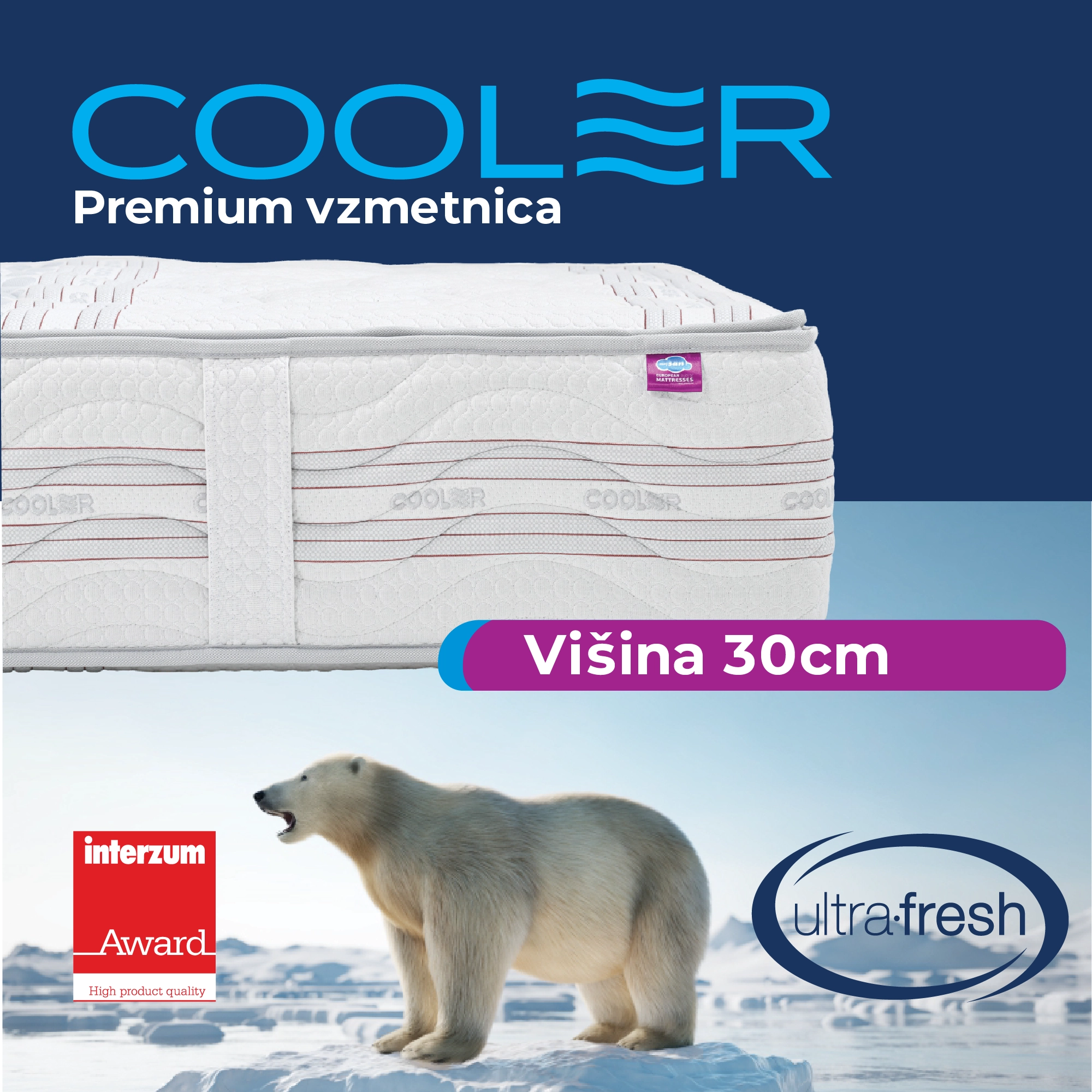Vzmetnica Cooler spada v linijo premijskih izdelkov MojSan®, ki se ponaša z izjemno strukturo iz najkakovostnejših materialov in končne obdelave. Zahvaljujoč idealni kombinaciji konstrukcijskih segmentov tega modela boste doživeli neverjeten občutek breztežnosti. Vzmetnica je izdelana v kombinaciji visokokakovostne spominske pene na eni strani in na drugi strani HR pene. Osnova vzmetnice je 7-consko super micropocket jedro, ki zagotavlja izjemno udobje. S svojo edinstveno Cooler tehnologijo je prejela prestižno nagrado za inovacijo na največjem sejmu pohištva v Kolnu. Vzmetnica Cooler je zasnovana za najzahtevnejše uporabnike, ki cenijo vrhunsko udobje.
