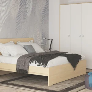 Klasična postelja z ravnimi linijami . Posteljo odlikuje eleganten dizajn v beli barvi s strukturo lesa (površina ni gladka, ampak so na njej vidne letnice). Postelja je izdelana iz iverala debeline 25 mm z lepo zaobljenimi robovi, kar prinaša dodatno udobje pri uporabi. Zgornji del vzglavne končnice je rahlo upognjen nazaj, kar omogoča udobno branje v postelji. Izdelana je v barvi beljenga bora.